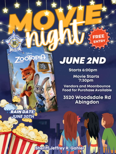 Sheriff Jeffrey R. Gahler and the Harford County Sheriff’s Office invite you all to join us on Friday, June 2nd, 2023, for our Free Outdoor Family Movie Night. The event will begin at 6:00 pm, everyone will have access to some of our local vendors, we will have a MoonBounce available for kids, and there will also be snacks and food available for purchase. For parking, please use the Park and Ride located at 3510 Woodsdale Rd., Abingdon. Our featured film will be “ZOOTOPIA” which will start at 7:30 pm.